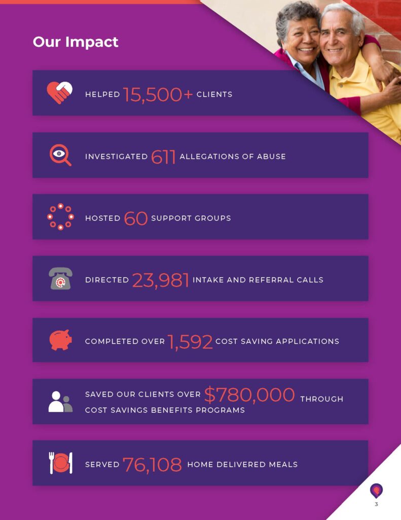 Our work is both innovative and compassionate, focused on helping individuals who are navigating the aging process have equal access to food, care, and safety. Services offered include: home-delivered meals and safety checks, in-home services, support groups, education, and respite for caregivers, protection from abuse, access to benefits for health insurance, Supplemental Nutrition Assistance Program (SNAP), energy, transportation, and property tax savings, assistance needed for safe transition from hospitals or skilled nursing facilities, shared housing, and general information about resources.